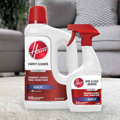 Win against life's toughest messes with HOOVER® Oxy Stain Remover. This fast-acting stain remover attacks and breaks down both old and new stains for easy cleanup. For best results, pair this solution with HOOVER®'s powerful assortment of carpet cleaning formulas and a HOOVER® carpet cleaning machine.